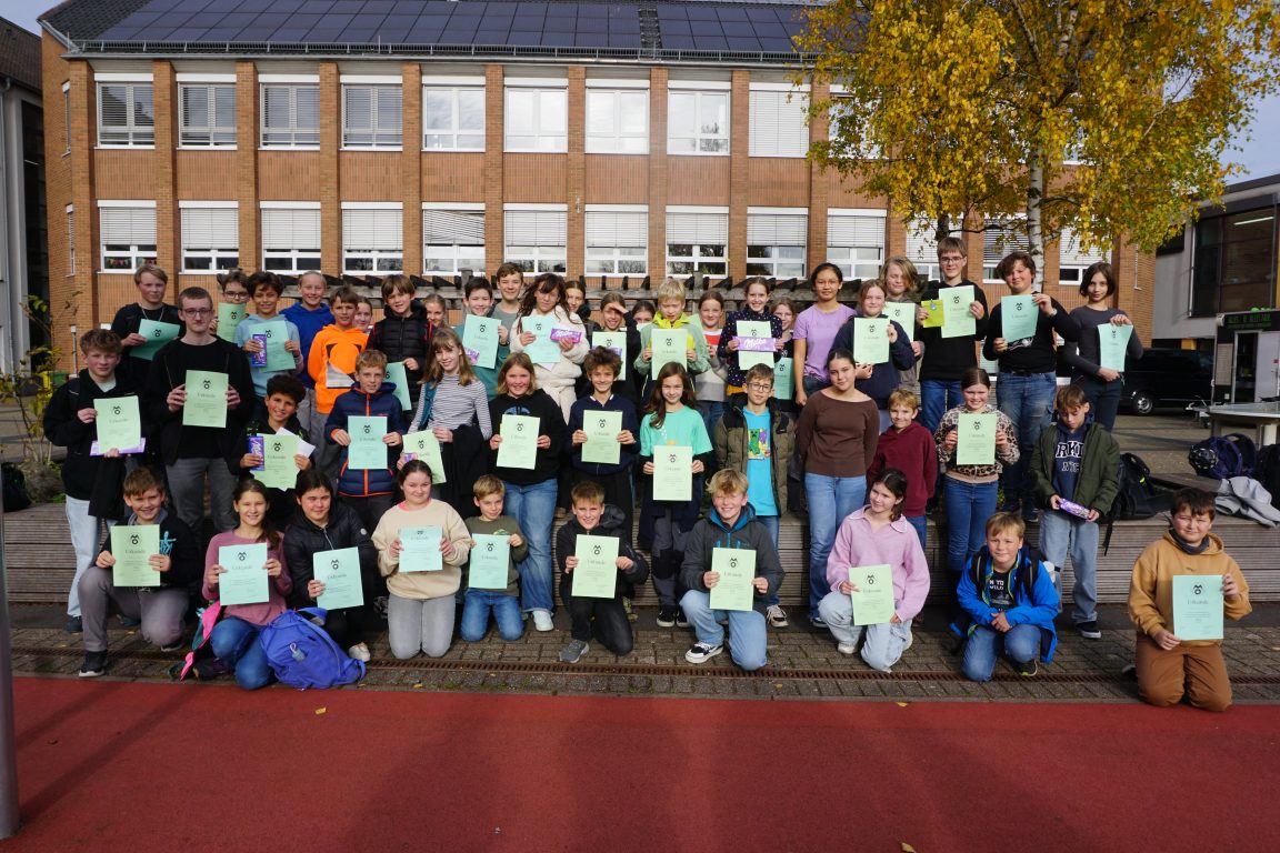 In diesem Jahr gab es sechsundzwanzig 3. Plätze, dreizehn 2. Plätze und fünf 1. Plätze. Die Platzierten konnten sich über Schokolade oder einen Buchgutschein freuen. Die Schüler: innen werden das RTG am 15. November in der Kreisrunde Unna vertreten. Hierfür drücken wir den Schülerinnen und Schüler die Daumen.