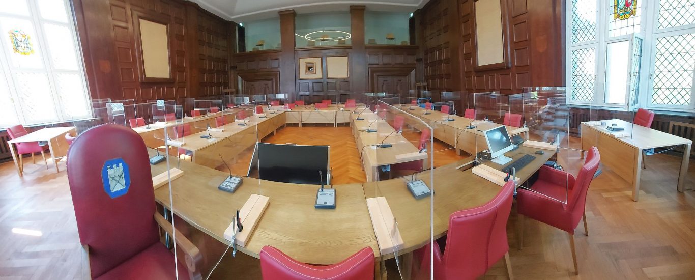 Seitdem ist viel passiert im Ratssaal, immer in Absprache mit der Denkmalbehörde. Er wurde auf den neuesten Stand der Technik gebracht, verfügt nun über einen Beamer und eine integrierte Leinwand hinter dem Verwaltungstisch. Die Vertreter*innen der Stadtverwaltung sehen auf einem großen Monitor das, was hinter ihnen auf der Leinwand gezeigt wird, z.B. bei Dokumentationen und Vorträgen. Die Deckenlampe ist modern, passt aber hervorragend zum Stil des Ratssaales. Akustisch wurde der Raum weiterentwickelt. Für die KNX-Gebäudesystemtechnik wurden knapp 4000 Meter Leitungen verlegt, die im nagelneuen Technikraum des Ratssaales zusammenlaufen.