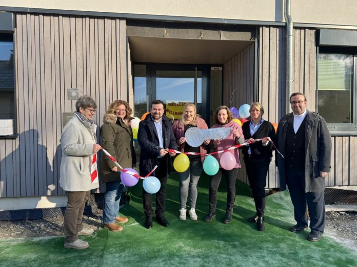 Die Kita Wandhofen wurde nun ihrer Bestimmung übergeben. Bürgermeister Dimitrios Axourgos durchschnitt symbolisch das Band und übergab die Einrichtung offiziell an Eva Waldheim, Leitung Kita Wandhofen, sowie Stephanie Barg, Leitung Kita Königsborn.