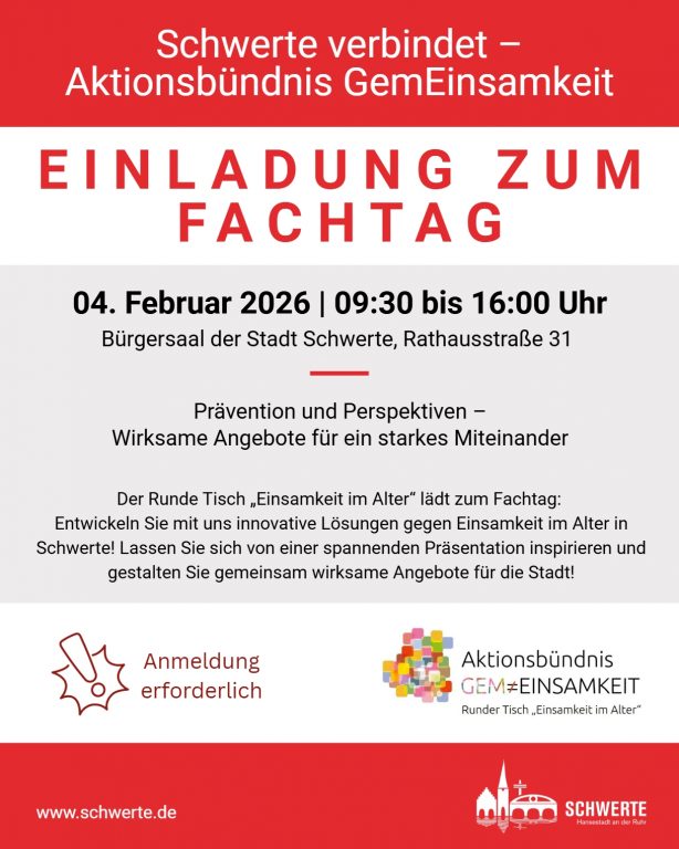 Am 4. Februar 2026 findet in Schwerte ein Fachtag des Runden Tisches „Einsamkeit im Alter“ statt. Bürgermeister Dimitrios Axourgos lädt gemeinsam mit dem Aktionsbündnis GemEinsamkeit alle Fachkräfte, bürgerschaftlich Engagierten und Interessierten dazu ein, sich aktiv an Lösungen gegen Einsamkeit im Alter zu beteiligen.