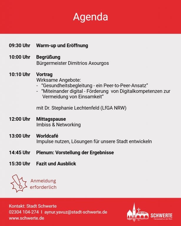 Der beiliegende Flyer enthält die Agenda und alle wichtigen Details zum zeitlichen Ablauf. Da die Teilnehmerzahl begrenzt ist, wird um zeitnahe Anmeldung gebeten. Anmeldungen nimmt Aynur Yavuz, Seniorenbeauftragte der Stadt Schwerte (Tel. 02304 104-274), sowie Andrea Schmeißer, Netzwerkbüro 60+ (Tel. 02304 939382), entgegen.