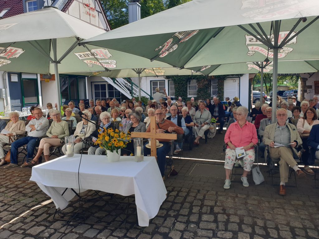 Auch der neue Betreiber des Gutshofs Wellenbad, nämlich das Montessori Campus Westfalia, zeigt sich gastfreundlich und ermöglichte den tradtioniellen ökumenischen Gottesdienst am Wellenbad. Im Innenhof und zugleich unter freiem Himmel luden die Evangelische Kirchengemeinde Schwerte und die Katholische Kirchengemeinde St. Marien Schwerte zu einem fröhlichen Miteinander ein. Gut 100 Christinnen und Christen ließen sich dazu einladen. Unter dem Motto „Einfach mal über Gott und die Welt reden“ gestalteten der Lehrer Harald Hochstein und Pfarrer Hartmut Görler einen unterhaltsamen Dialog. Musikalisch begleitet wurden die beiden vom Posaunenchor Geisecke-Lichtendorf. Nach dem Gottesdienst standen Kaffee und Kuchen bereit. Mit der Kollekte über 464 Euro unterstützen die beiden Kirchengemeinden ein Waisenprojekt in Indien, mit dem die Montessori-Schule schon lange verbunden ist. Viele Ehrenamtliche hatten zuvor dafür gesorgt, dass alle Gäste einen Sitzplatz finden konnten. Dieser Gottesdienst soll wiederholt werden und zukünftig immer am ersten Wochenende nach den Sommerferien stattfinden.