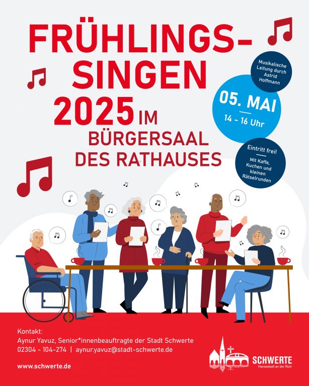 Der Frühling zeigt sich von seiner schönsten Seite – Zeit, ihn gemeinsam zu feiern! Am Montag, den 5. Mai 2025, lädt die Stadt Schwerte um 14 Uhr herzlich zum Frühlingssingen in den Bürgersaal des Rathauses ein.