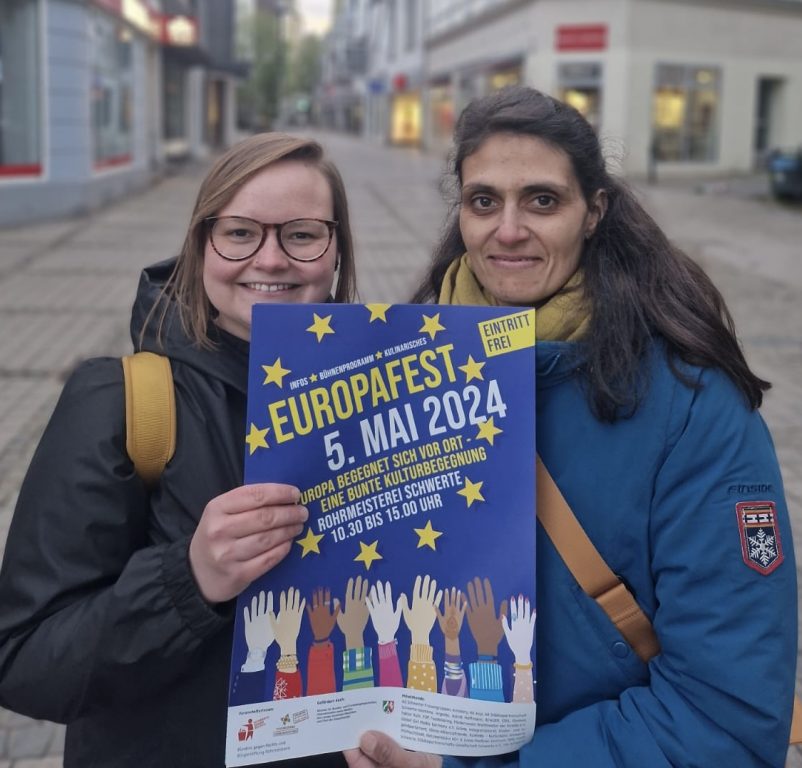über 30 Akteurinnen am 05. Mai auf das Plateau der Rohrmeisterei. Am 05. Mai ist viel los in Schwerte: Verkaufsoffener Sonntag, Mai Kirmes und das Entenrennen der Rotary. In die Reihe der Veranstaltungen bringt sich das Europafest ein und macht einen abwechslungsreichen Spaziergang von der Rathausstraße, durch die Stadt, über die Rohrmeisterei bis hin zur Ruhr möglich. Wie immer, geht um etwas: „Das bunte Fest der europäischen Begegnung, soll ein Zeichen setzen und die vielfältigen Facetten von Europa vor Ort erlebbar machen“ so Jennifer Peters von der Bürgerstiftung. „In einer Demokratie wird oft kontrovers diskutiert, aber wir wollen den Fokus an diesem Tag auf Freude und Engagement legen. Politik macht Spaß und wird von Menschen vor Ort gestaltet, das wollen wir zeigen!“ so Nele Blase vom Bündnis gegen Rechts. „Wir informieren über die Parteiprogramme, zeigen welche Gesichter hinten den Parteien stehen und möchten einfach motivieren bunt zu wählen, denn das ist wichtiger denn je!“ . Zur Eröffnung des Festes um 10.30 Uhr laden die Bürgerstiftung und der KuWeBe zu Sektempfang und Panel. Der Talk steht unter dem Motto: „Kultur und Demokratie- Die Bedeutung für Europa“ . Auf dem Podium sind vertreten: Dritte Orte, Kulturbüro, KIS, Konzertgesellschaft und Studio7. Ein europäisches Highlight: Studio7 werden live von ihrer Italien Projektreise zugeschaltet. Außerdem werden den ganzen Tag über Grußbotschaften der europäischen Partnerstädte übertragen. Auf der Bühne ist den ganzen Tag über Programm: Live-Musik von B/AUER und Fading reflections und eine besondere politisch-magische Zaubershow von Tobias Walkmann. Zum Mitmachen laden Tänze von Amnesty sowie Singen mit Astrid Hoffmann ein. Das Kinder- und Jugendparlament ist auch mit einem außergewöhnlichen Format vor Ort: In einem öffentlichen Speeddating werden sich jeweils drei Jugendliche mit drei Politikerinnen auf der Bühne unterhalten und fragen, worauf es Jugendlichen in Europa