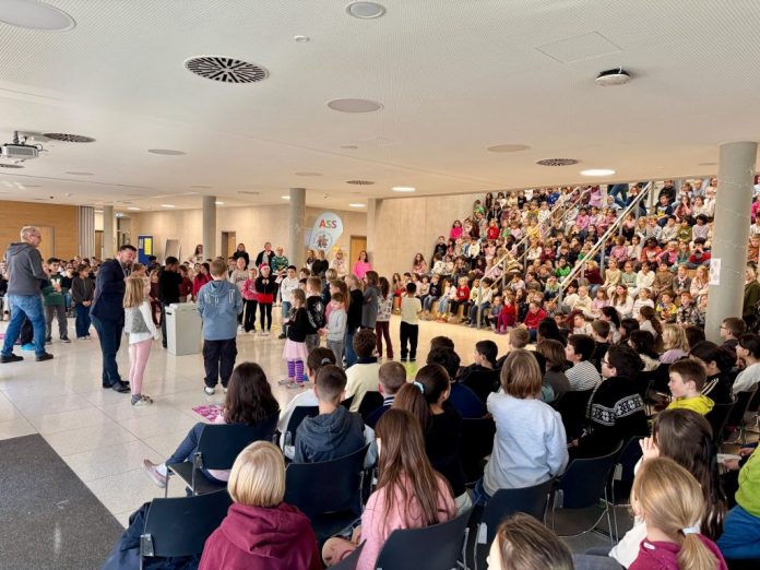 Mit großer Spannung verfolgten die Schüler*innen der Albert-Schweitzer-Schule die Bekanntgabe des Ergebnisses ihres Schüler*innenhaushalts. Die Freude war riesig, als Bürgermeister Dimitrios Axourgos das Siegerprojekt verkündete: In geheimer Wahl hatten sich die Grundschüler*innen für einen gemeinsamen Hüpfburgentag mit allen Klassen entschieden.