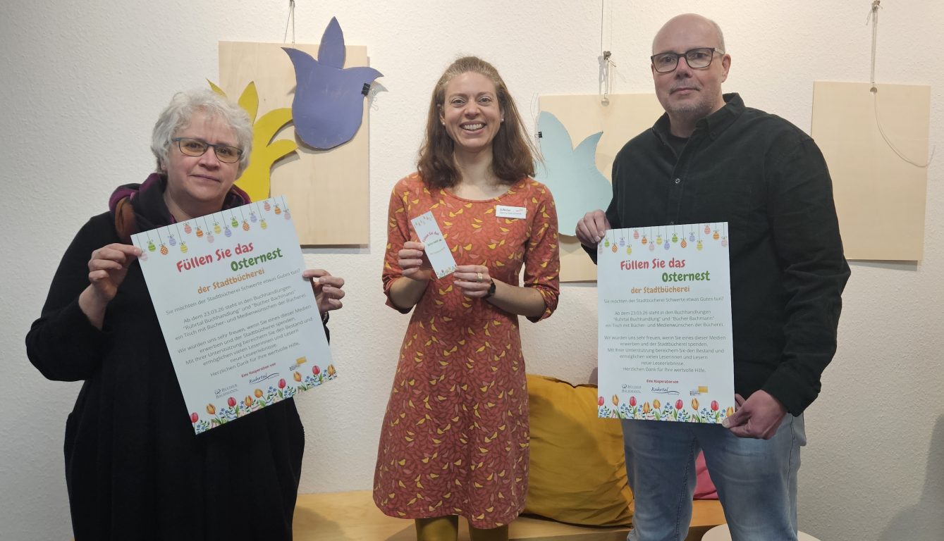Die Stadtbücherei Schwerte startet gemeinsam mit der Ruhrtal Buchhandlung und der Buchhandlung Bücher Bachmann eine besondere Oster-Spendenaktion: Ab dem 23. März bis Ende April 2026 präsentieren beide Buchhandlungen ausgewählte Wunschmedien der Stadtbücherei auf Aktionstischen. Bürgerinnen und Bürger können vor Ort einen Titel auswählen, erwerben und als Schenkung in das „Osternest“ der Stadtbücherei legen.
