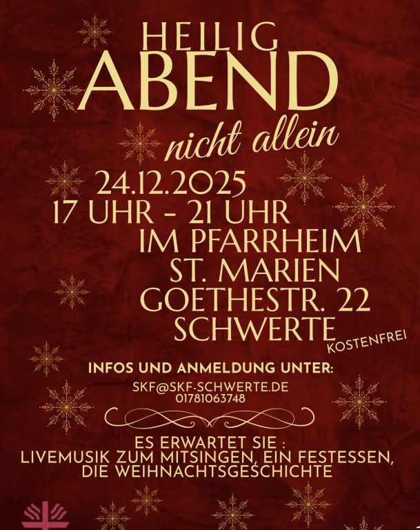 Heilig Abend nicht allein. Seit über 40 Jahren veranstalten der SkF eine Feier im Pfarrheim St. Marien in Schwerte am heiligen Abend zwischen 17 und 21 Uhr. Ein ehrenamtliches Team (ca. 10 Personen) bereitet eine wunderschöne Weihnachtsfeier vor. Ein Musikerduo begleitet die Feier mit Livemusik, ein Pastor liest die Weihnachtsgeschichte, das Marienkrankenhaus Schwerte stellt ein Festessen und ehrenamtliche FahrerInnen holen die Menschen von zu Hause ab und bringen sie nach der Feier auch wieder nach Hause.