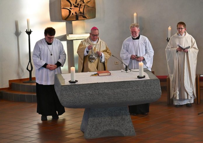Noch einmal war die Heilig Geist-Kirche an der Ostberger Straße gut gefüllt – am Sonntag wurde in dem 1958 erbauten katholischen Gotteshaus zum letzten Mal eine Heilige Messe gefeiert. Der Paderborner Weihbischof Josef Holtkotte verlas das Dekret zur Profanierung des Kirchengebäudes, der Kelch mit dem Allerheiligsten wurde zur Pfarrkirche St. Marien gebracht. Eine besondere Ikone, die in Heilig Geist in 66 Jahren „Dienstzeit“ immer ausgestellt war, hat der Weihbischof persönlich ins gegenüberliegende Alten- und Pflegeheim Haus Schwerte gebracht. Dort im großen Aufenthaltsraum finden jetzt die Gottesdienste für den Pfarrbezirk Schwerte-Ost nach Plan statt.