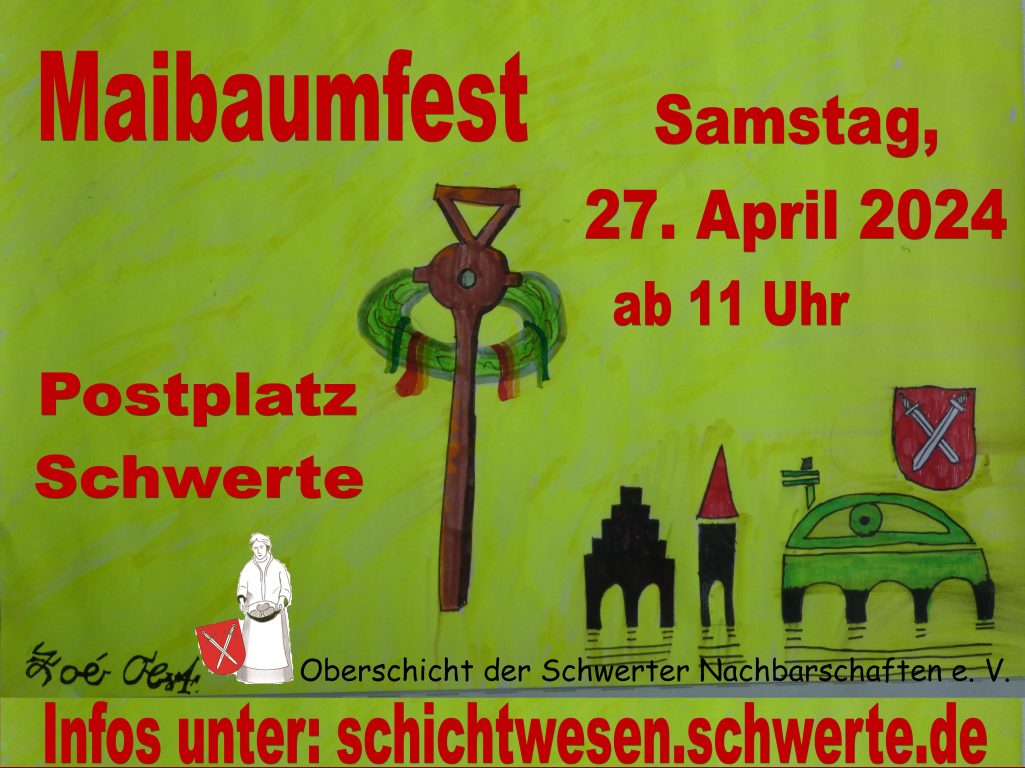 Auch in diesem Jahr wird der Maibaum auf dem Postplatz aufgestellt. Termin ist diesmal Samstag, der 27.04.2024; das Fest beginnt um 11 Uhr. In den letzten Jahren hat sich dieses kleine Fest des Oberschichts der Schwerter Nachbarschaften e. V. beim Maibaumaufbau etabliert. Sie können also nicht nur dabei zusehen wie der Maibaum aufgerichtet wird oder auch kräftig mit anpacken, sondern es gibt auch wieder leckere Schwerter Pannekauken. Der Kreinbergbrauverein hat eigens ein leckeres Maibockbier gebraut; aber natürlich gibt es auch alkoholfreie Getränke. Sie können auch das Schwerter Sagenbuch und andere Schwerter Dinge gegen Spende erwerben. Informationen zum Schwerter Schichtwesen und zur Schwerter Jugendfeuerwehr erhalten Sie kostenlos. Der Reinerlös des Festes ist für die Schwerter Jugendfeuerwehr. Infos finden Sie auch auf unserer Internetseite www.schichtwesen.schwerte.de