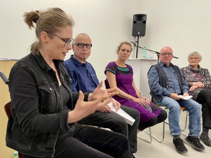 Mit feinsinnigen Perspektiven bereicherten die Künstlerinnen Sara Buschulte (Musikerin) und Jessica Toliver (Malerin und Installationskünstlerin) die Diskussion im Philosophen Café der KIS-Gruppe auf.ruhr zu der Frage: Wozu brauchen wir Kunst? Nach einer wissenschaftlichen Einführung von Brigitte Fritz und Hartmann Schimpf führte Moderator Jochen Born durch die äußerst rege Diskussion der Teilnehmenden im voll besetzten Vortragsraum des Wuckenhofs in Schwerte.