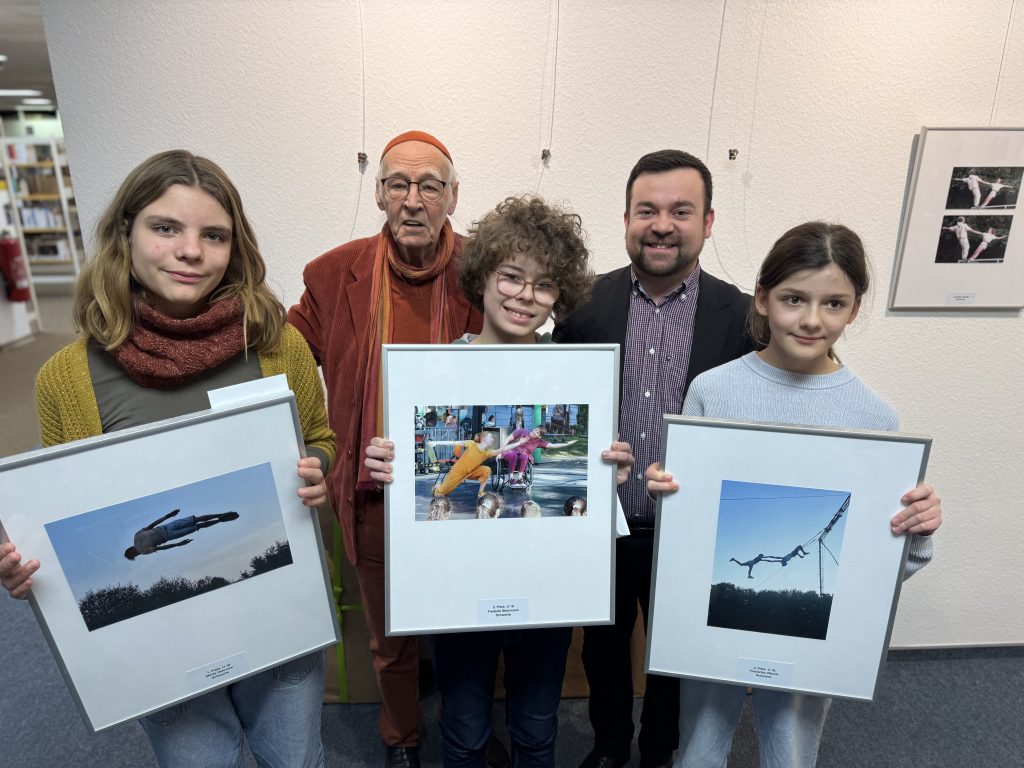 Bürgermeister Dimitrios Axourgos betonte in seiner Ansprache die Bedeutung der Kultur als positive Kraft: „Die Kultur als positive Seite des Lebens in den Mittelpunkt stellen zu dürfen, ist gerade in Zeiten weltweiter Krisen besonders wertvoll.“ Als Schirmherr des U18-Wettbewerbs überreichte Axourgos gemeinsam mit Harald Mante die Preise an die jungen Fotograf*innen – allesamt aus Schwerte. Der erste Preis ging an Marla Henrichs, gefolgt von Frederik Gliesmann auf Platz zwei und Friederica Ulbrich auf Platz drei. Ihre Werke zeigen eindrucksvolle Aufnahmen von fliegenden Akteuren der belgischen Gruppe „Collectif Maluné“ sowie tanzenden Künstlern der britischen Formation „Daryl & Co and Mimbre“.