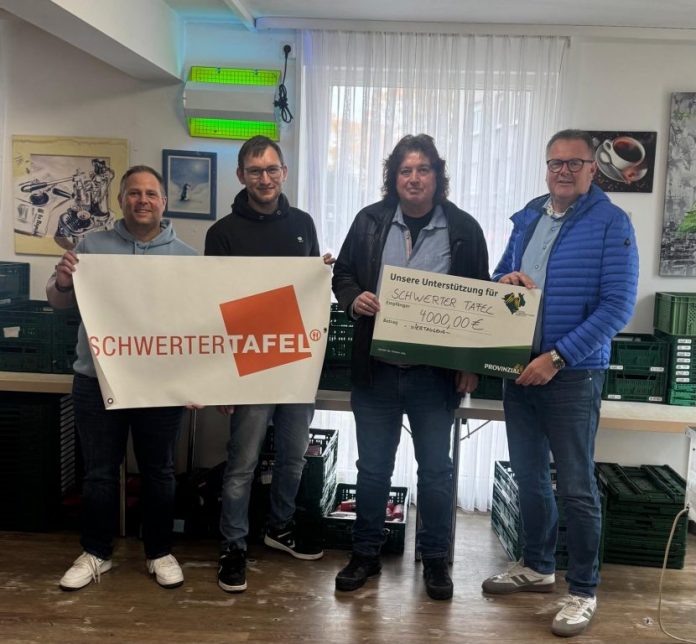 Ralf Hettwer, Vorstandsmitglied des Vereins „Provinzialer in Westfalen-Lippe helfen e.V.“, und Jens Merken, Geschäftsstellenleiter der Schwerter Provinzialgeschäftsstelle, haben gemeinsam eine Spende in Höhe von 4.000 Euro an die Schwerter Tafel überreicht. Mit dieser Zuwendung möchte der Verein die wichtige Arbeit der Tafel in Schwerte nachhaltig unterstützen.