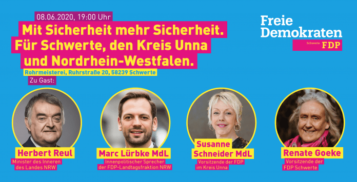 Die Schwerter FDP lädt am 08.06. um 19.00 Uhr zu ihrer Veranstaltung „Mit Sicherheit mehr Sicherheit. Für Schwerte, den Kreis Unna und Nordrhein-Westfalen“ in die Rohrmeisterei ein.
