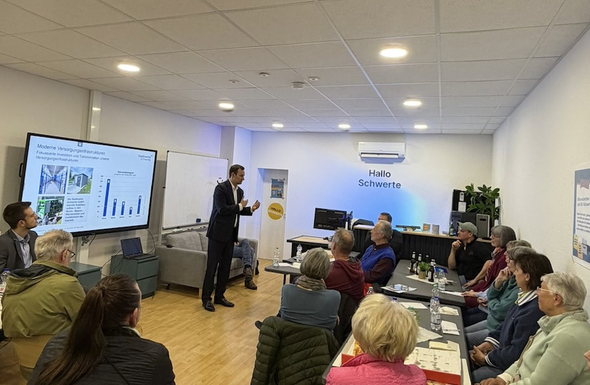 Rund 30 interessierte Bürgerinnen und Bürger folgten der Einladung zum „Schwerter Gespräch“ der CDU Schwerte mit dem Geschäftsführer der Unternehmensgruppe Stadtwerke Schwerte. In seinem anschaulichen Vortrag erläuterte Herr Kirchmann die Strukturen, Aufgaben und aktuellen Herausforderungen der Stadtwerke. Besonders die Themen erneuerbare Energien sowie die Zusammensetzung der Energiepreise stießen auf großes Interesse.