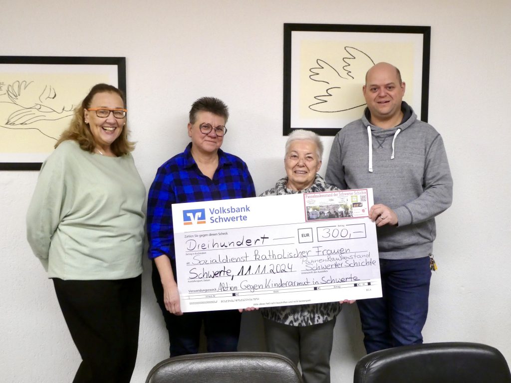 Die Pannekauken am Stand der Schwerter Schichte auf dem Pannekaukenfest 2024 fanden so reißenden Absatz, dass vom Erlös 300 € dem Sozialdienst katholischer Frauen für die Aktion „Gegen Kinderarmut in Schwerte“ gespendet werden konnten. Diese Aktion gibt es seit vielen Jahren und die Unterstützung kommt direkt den betroffenen Kindern zugute. Schulen, Kindergärten usw. können sich an den Sozialdienst katholischer Frauen wenden und dieser unterstützt und berät die betroffenen Familien. Seit der Corona-Pandemie erhält der Sozialdienst nur noch ca. 1/3 der Spendensumme, wie vor der Pandemie und ist deshalb froh um jede noch so kleine Spende, die seine wichtige Arbeit unterstützt.