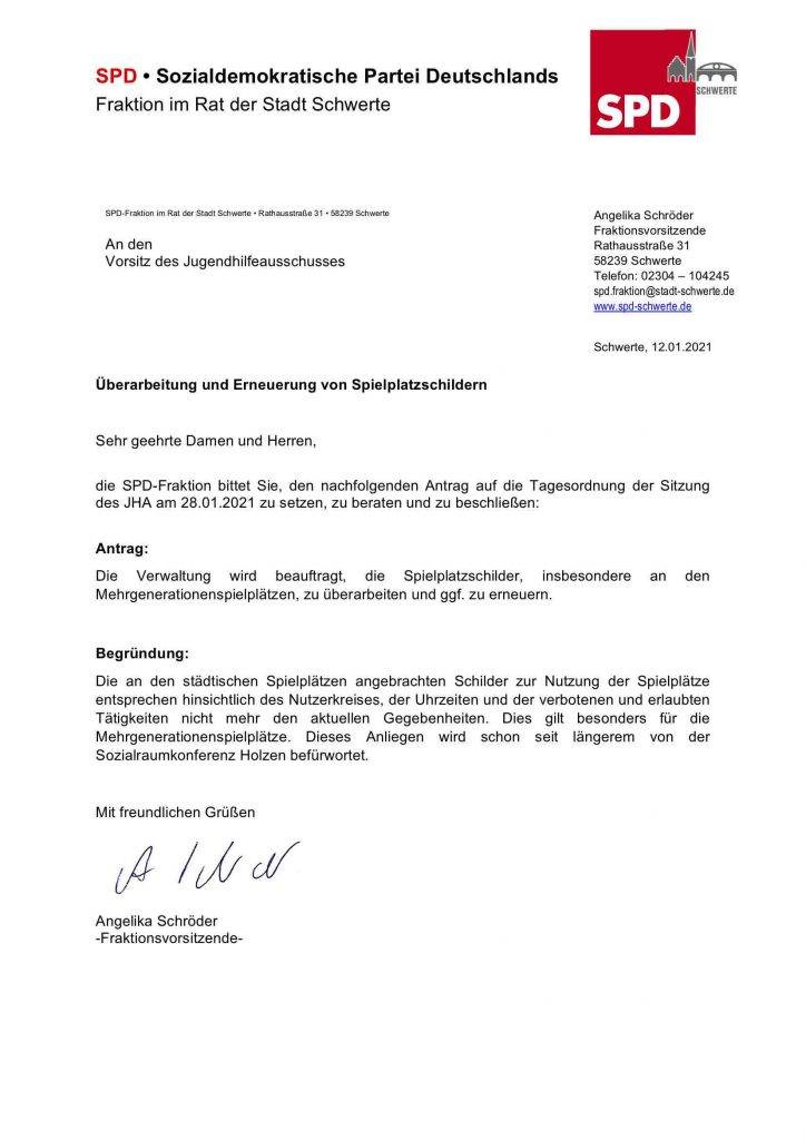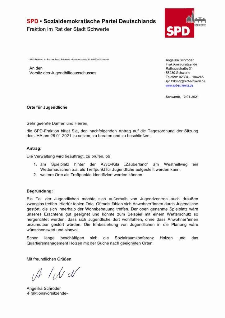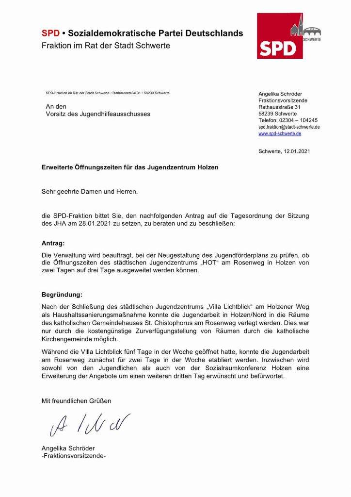 LokalesPolitik SPD mit 3 Anträgen für den Jugendhilfeausschuss Von Redaktion - Januar 12, 2021 0 689 (Foto: © Th.Schmithausen) Am 28.01.2021 tagt wieder der Jugendhilfeausschuss der Stadt im Bürgersaal. Hierzu hat die SPD-Fraktion 3 Anträge vorbereitet: Quelle: SPD-Fraktion im Rat der Stadt Schwerte