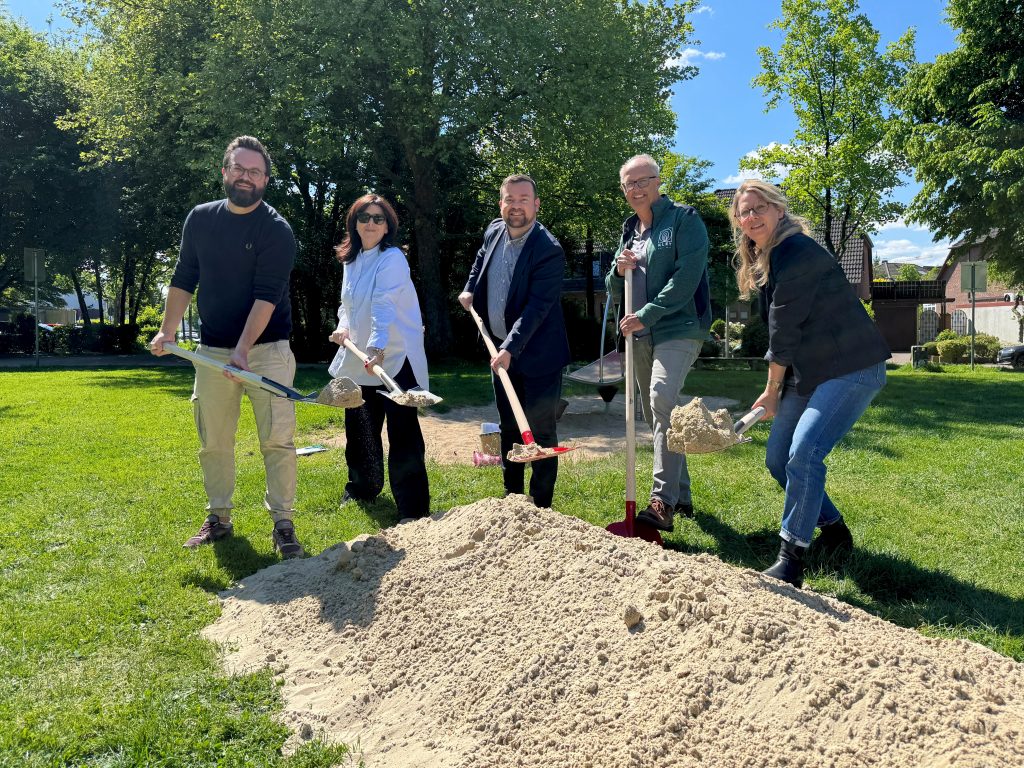 Mit dem symbolischen Spatenstich fiel der Startschuss für die Neugestaltung des Spielplatzes an der Friedrich-Hegel-Straße. Bürgermeister Dimitrios Axourgos setzte gemeinsam mit seiner Referentin Gabriele Stange, Katja Freudenberger und Christian Heppner (Stadt Schwerte) sowie Johannes Drüppel (Firma Kley) den ersten Spatenstich und markierte damit den offiziellen Baubeginn.