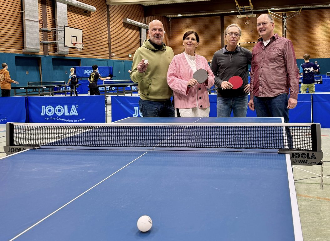 Gabriele Stange, als Amtsleiterin innerhalb der Stadtverwaltung zuständig für den Sport, und Peter Schubert, Vorsitzender des Stadtsportverbands, nutzten die Gelegenheit, die TTVg beim Training in der Sporthalle am Stadtpark zu besuchen. Dort erläuterten der 1. Vorsitzende Oliver von Colson und Geschäftsführer Markus Kleff den Gästen die Unterschiede verschiedener Tischtennisplatten, typische Trainingsabläufe und die Vereinsstrukturen.