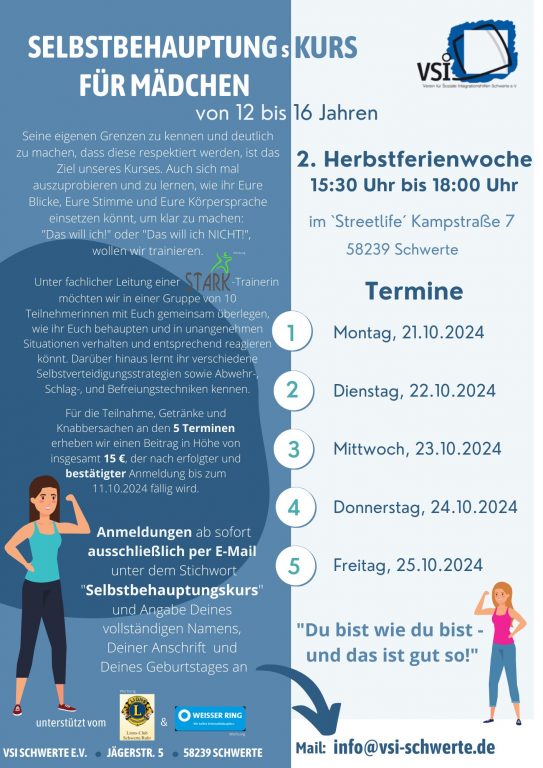 In der zweiten Herbstferienwoche findet vom 21.10. – 25.10.2024 der nächste Selbstbehauptungskurs für Mädchen im Alter von 12 bis 16 Jahren statt. Von Montag bis Freitag, treffen sich die Teilnehmerinnen in der Zeit von 15.30 Uhr bis 18.00 Uhr in den Räumen des Vereins für Soziale Integrationshilfen (VSI) e.V..
